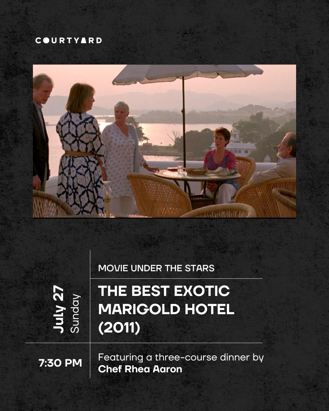 Join us for an open-air screening of The Best Exotic Marigold Hotel (2011), with a three-course dinner by Chef Rhea Aaron and popcorn.